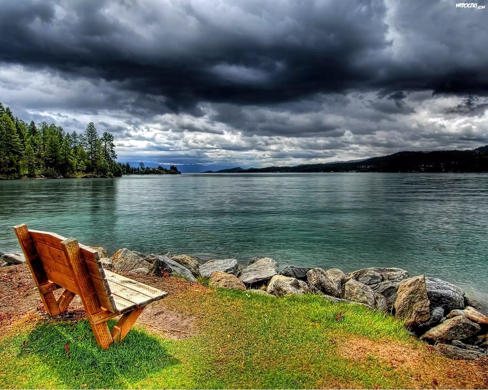 Zdjęcia, Jezioro, Chmury, Ławka, Kamienie