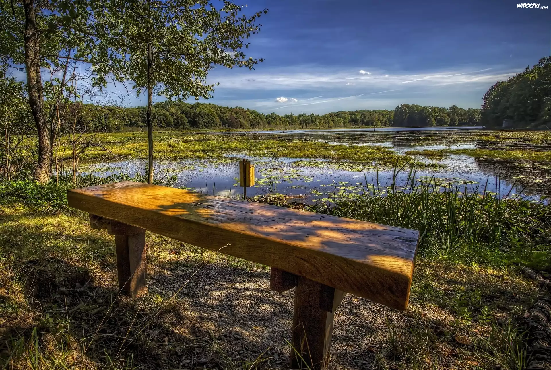 Zdjęcia, Jezioro, Drzewa, Ławka, Roślinność