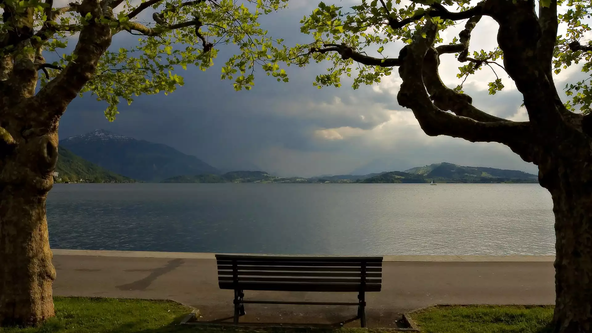 Zdjęcia, Jezioro, Plaża, Góry, Ławka, Drzewa