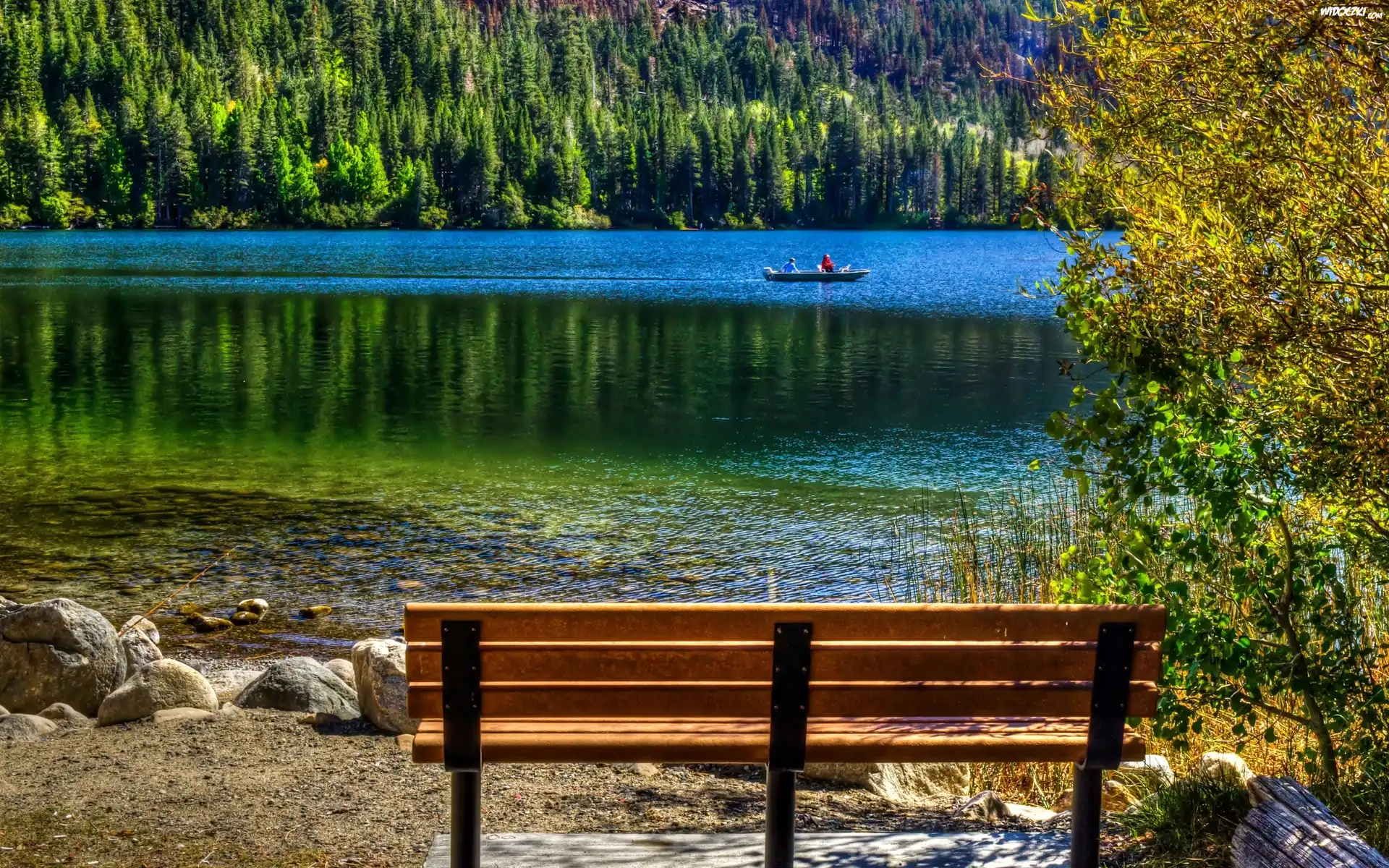 Zdjęcia, Jezioro, Łódka, Ławka, Lasy