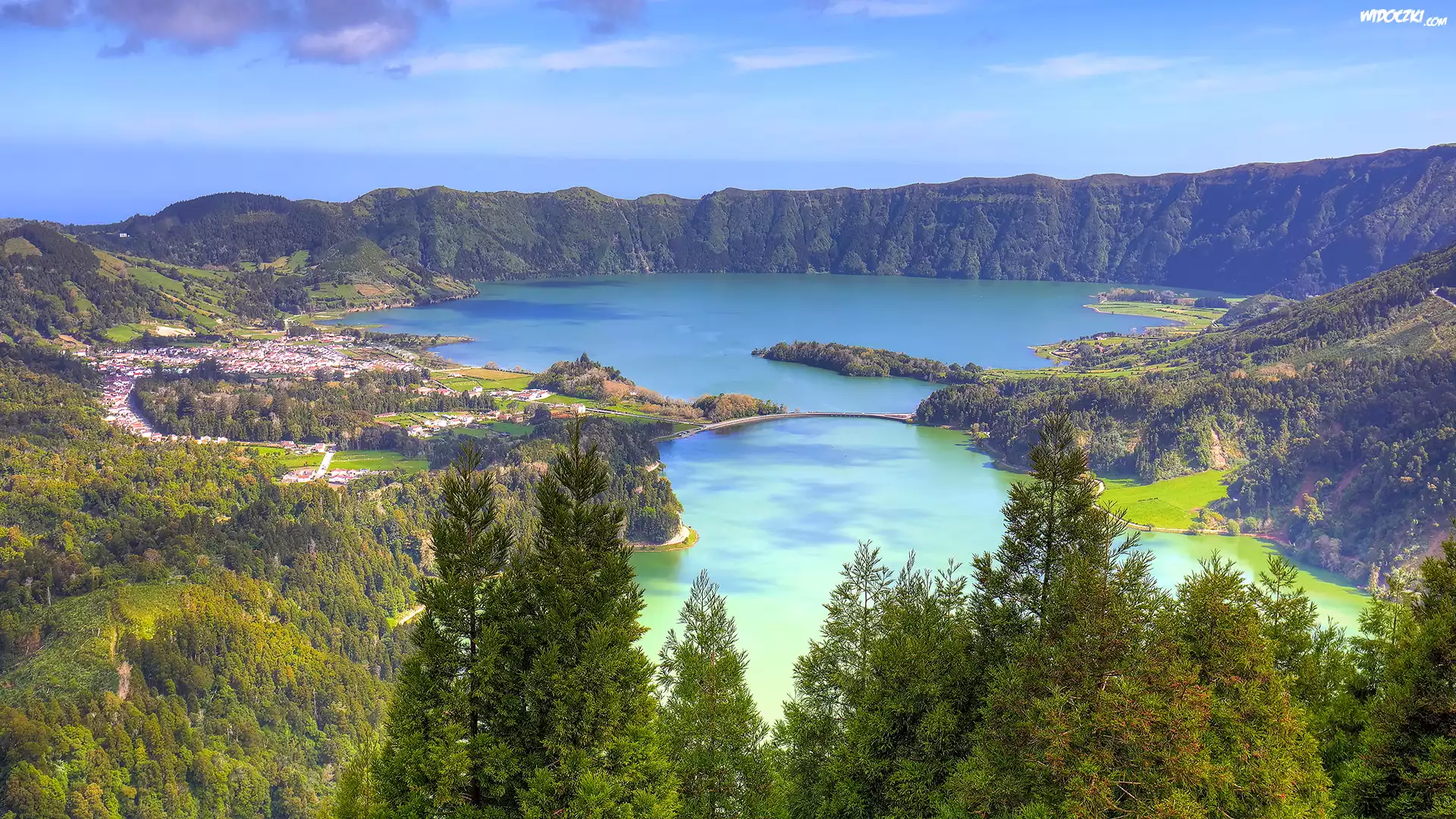 Jezioro Azul, Jezioro Verde, Wzgórza, Lasy, Drzewa, Obłoki, Miasto Ponta Delgada, Sete Cidades, Wyspa Sao Miguel, Azory, Portugalia |