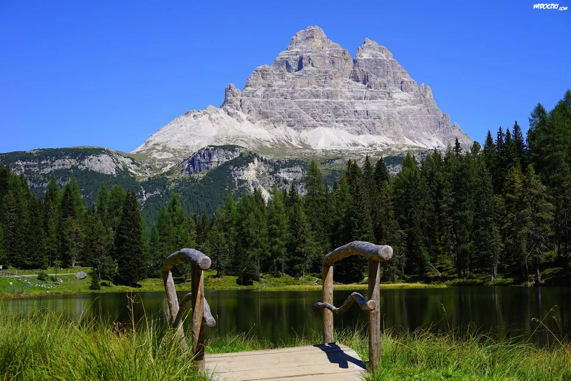 Jezioro, Antorno Lake, Mostek, Góry, Dolomity, Masyw Tre Cime di Lavaredo, Las, Drzewa, Prowincja Belluno, Włochy |