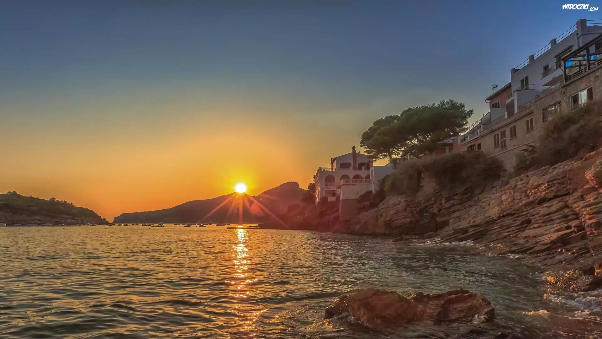 Zdjęcia, Jezioro, Zachód, Słońca, Brzeg, Domy