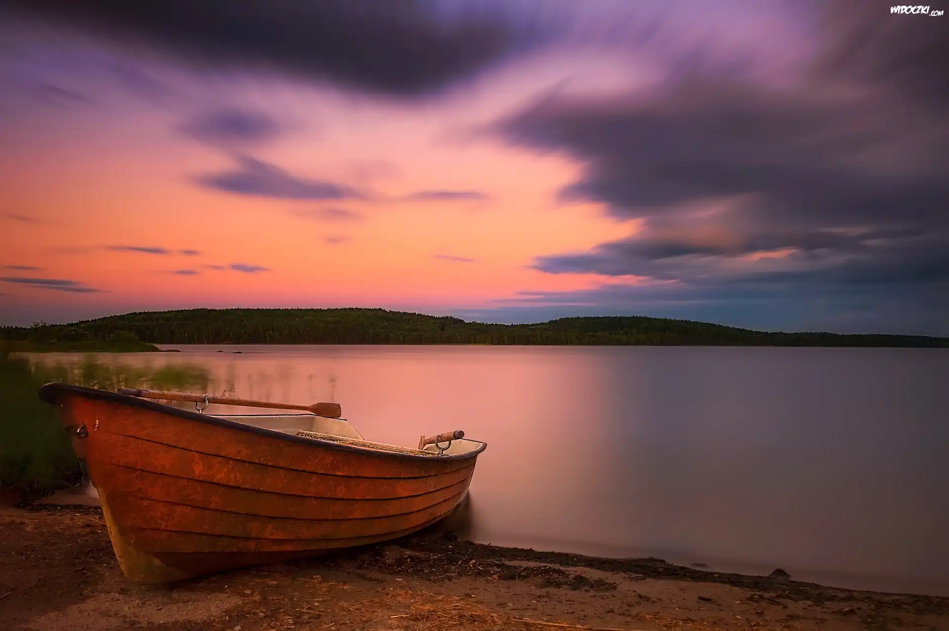 Zdjęcia, Jezioro, Zachód, Słońca, Brzeg, Łódź