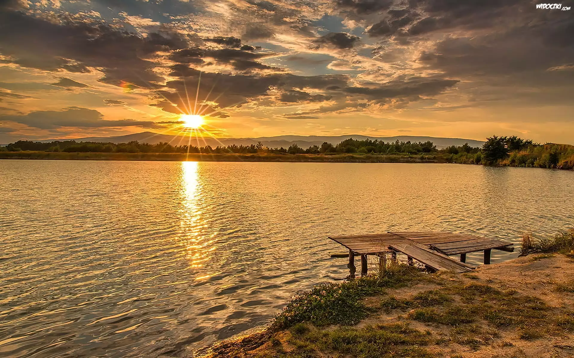Zdjęcia, Jezioro, Zachód, Słońca, Brzeg, Pomost