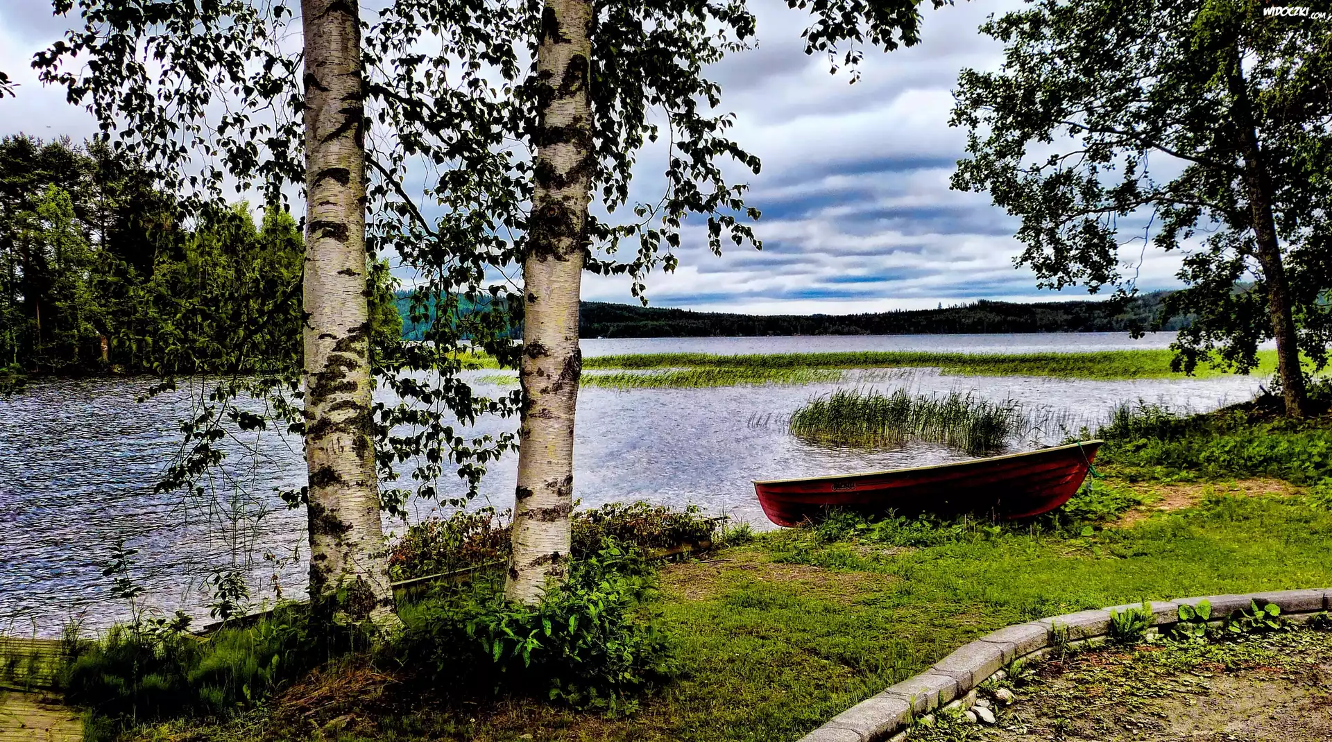 Zdjęcia, Jezioro, Łódź, Brzozy, Trawa