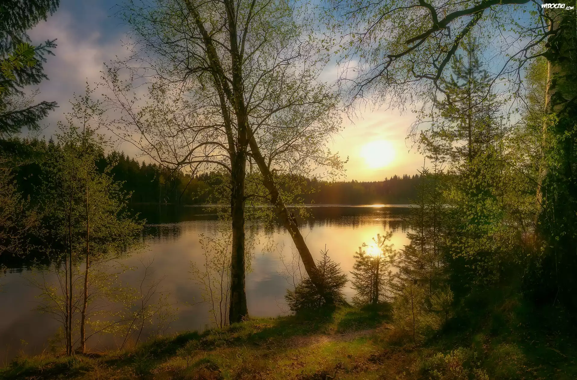 Zdjęcia, Jezioro, Zachód słońca, Wiosna, Brzozy, Las