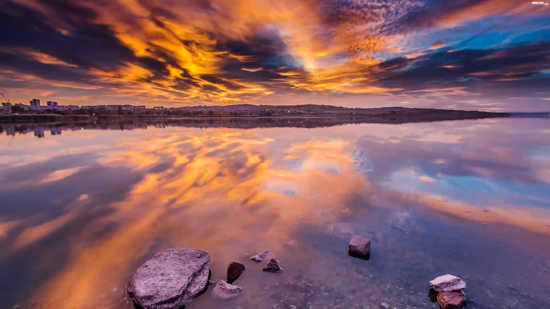 Jezioro, Zachód słońca, Chmury, Budynki, Odbicie