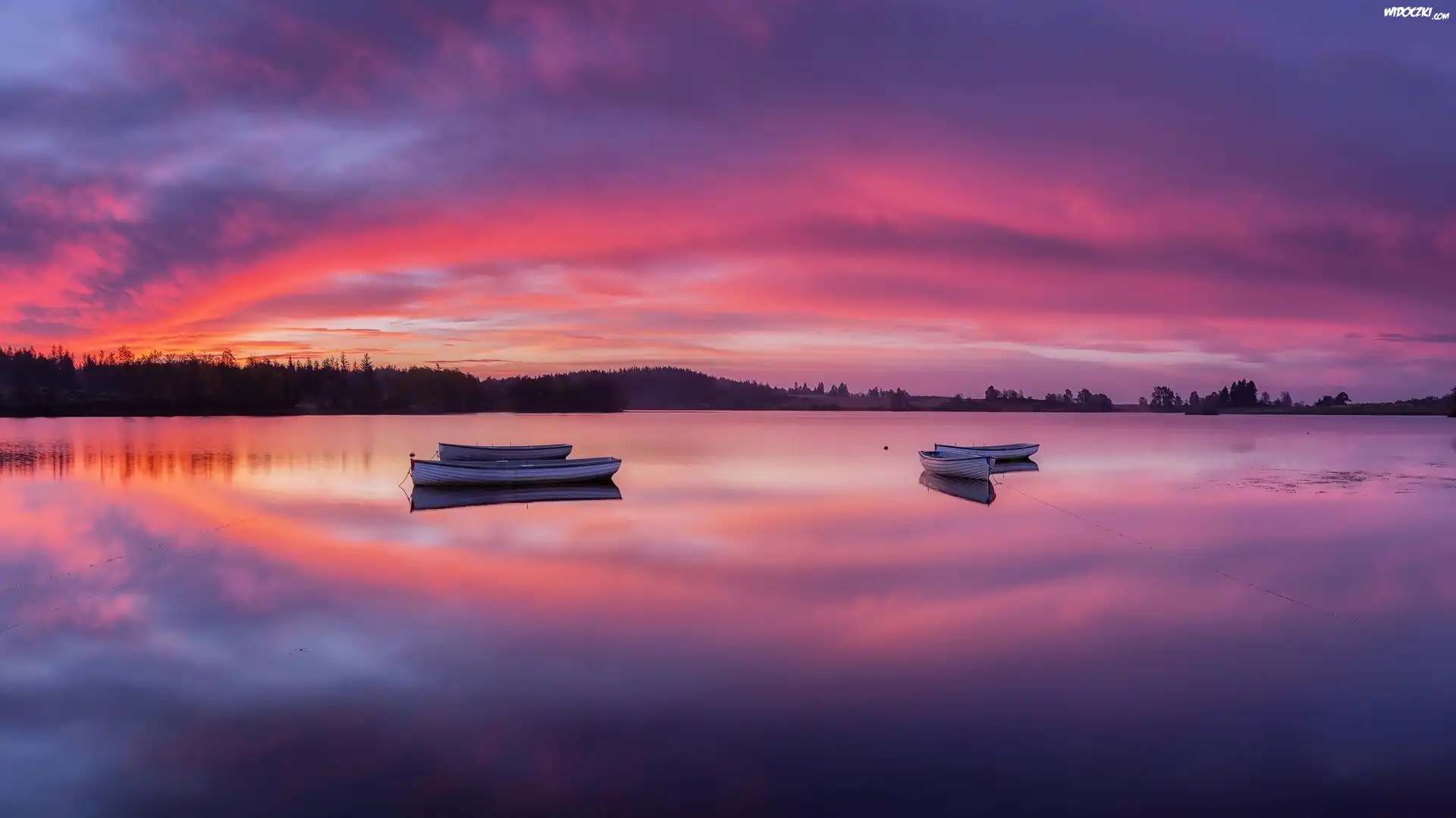 Jezioro Loch Rusky, Park Narodowy Loch Lomond and the Trossachs, Łódki, Zachód słońca, Miejscowość Callander, Szkocja |