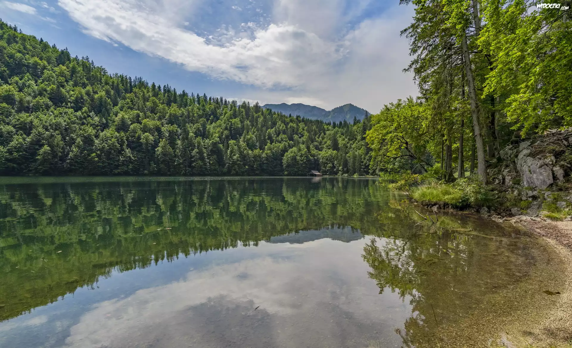 Zdjęcia, Jezioro, Toplitzsee, Brzeg, Las, Drzewa, Góry, Alpy, Odbicie, Chmury, Austria