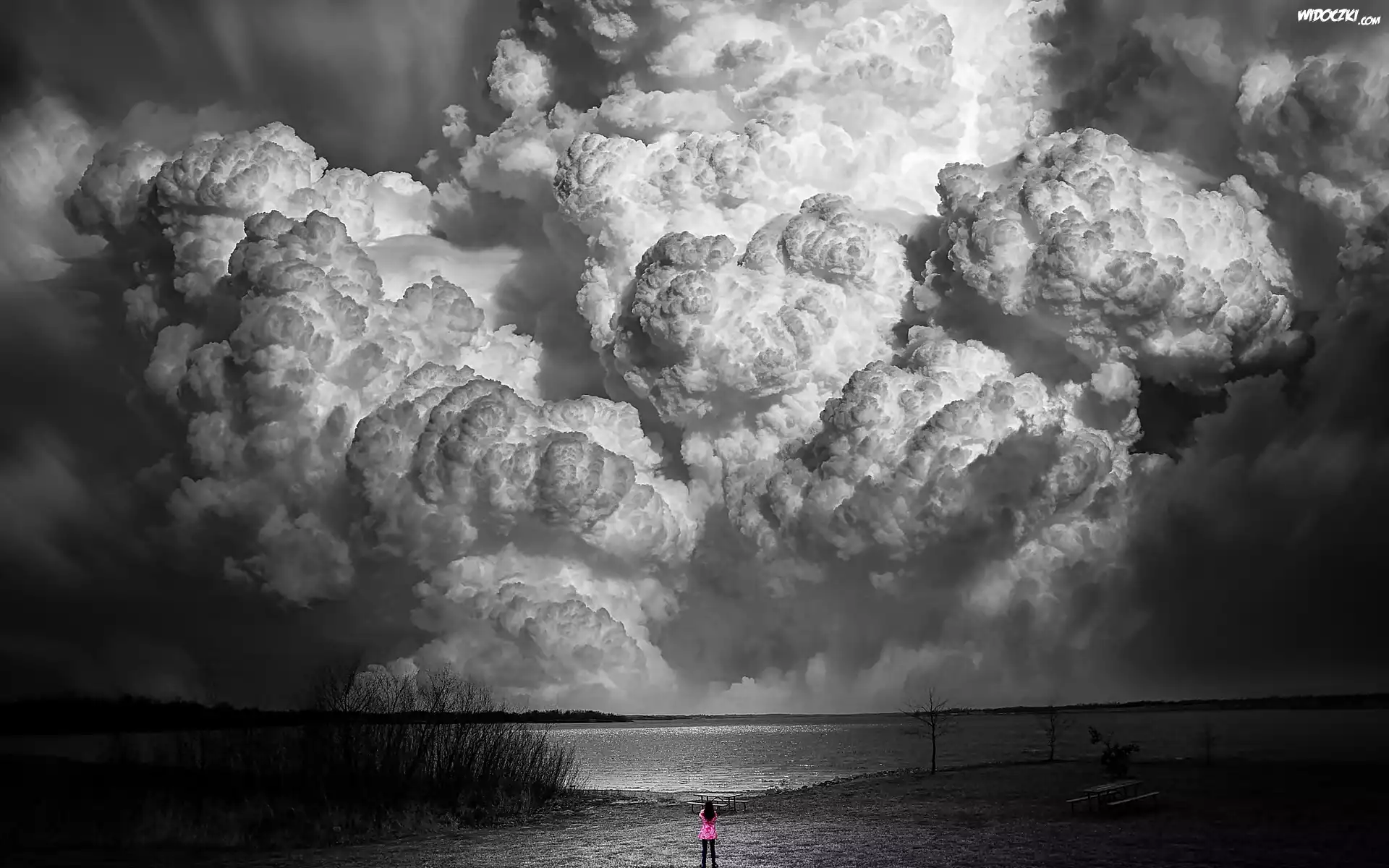 Zdjęcia, Jezioro, Chmura, Chmury, Dziewczyna