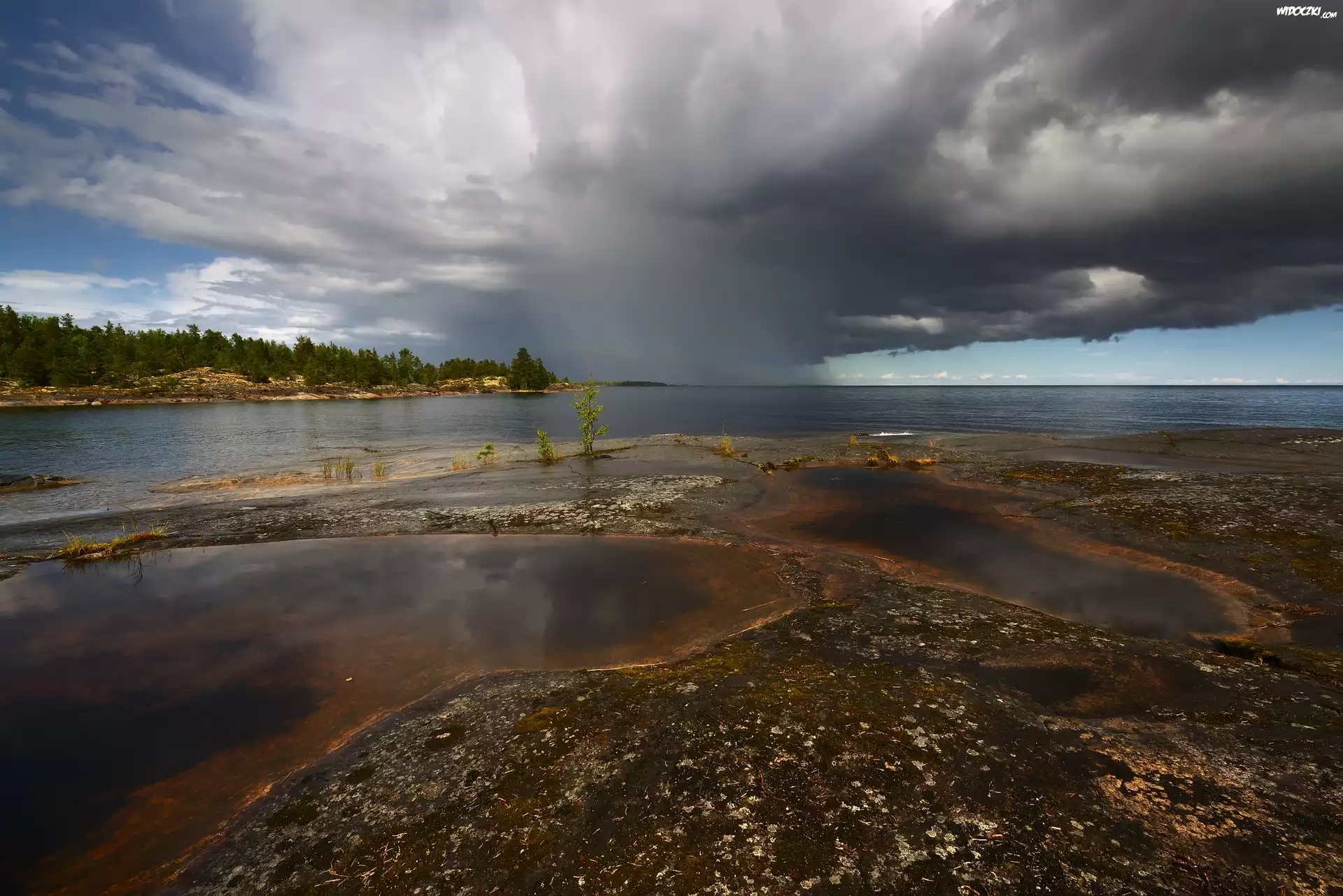 Zdjęcia, Jezioro, Skała, Ciemne, Chmury, Drzewa