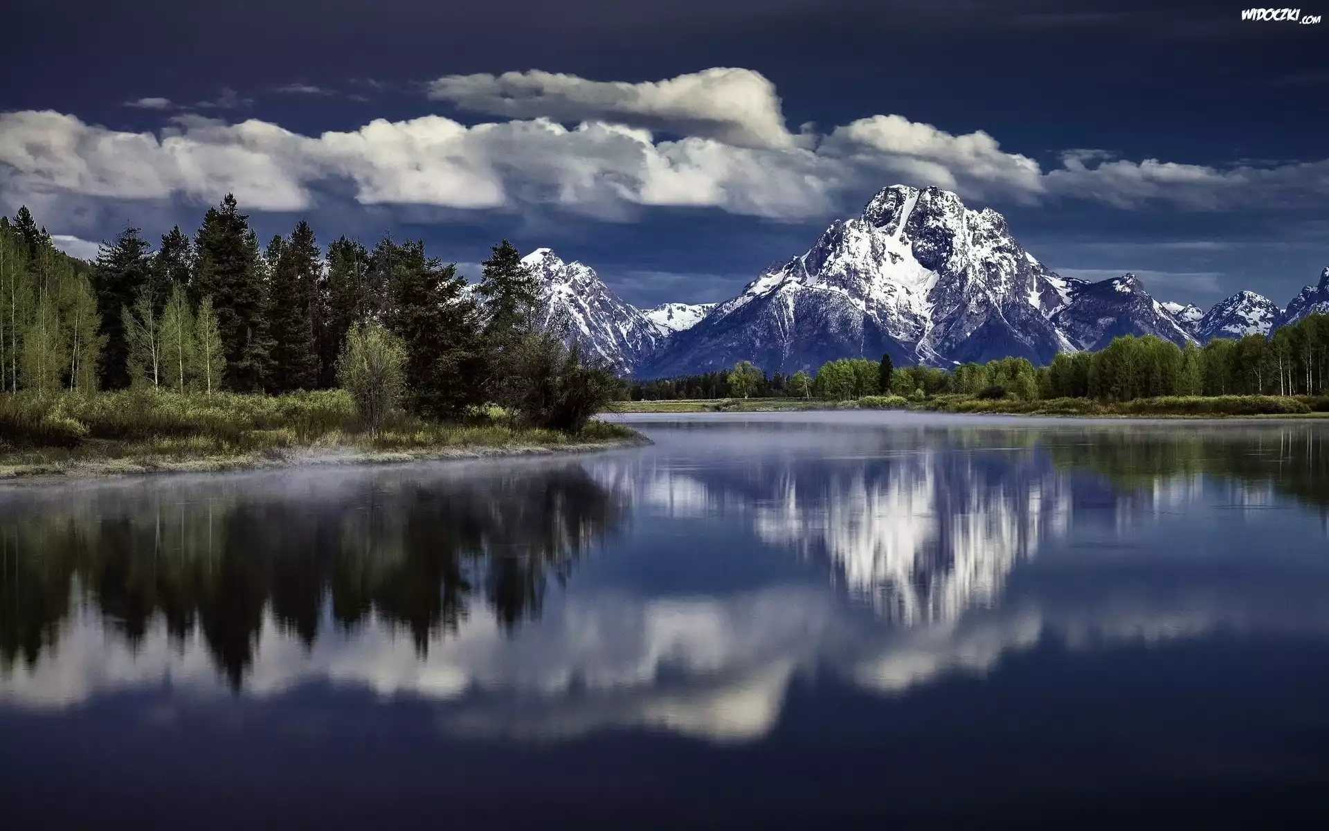 Jezioro, Góry, Drzewa, Chmury, Odbicie