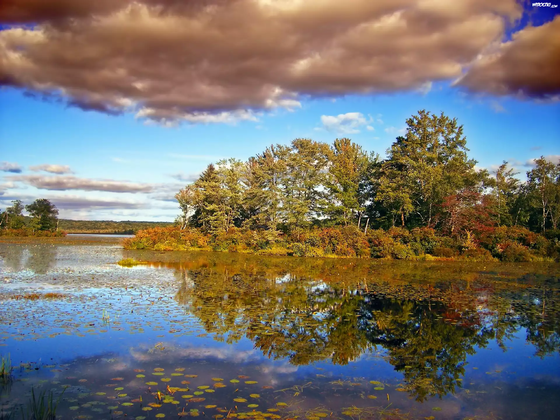 Zdjęcia, Jezioro, Drzewa, Chmury, Jesień