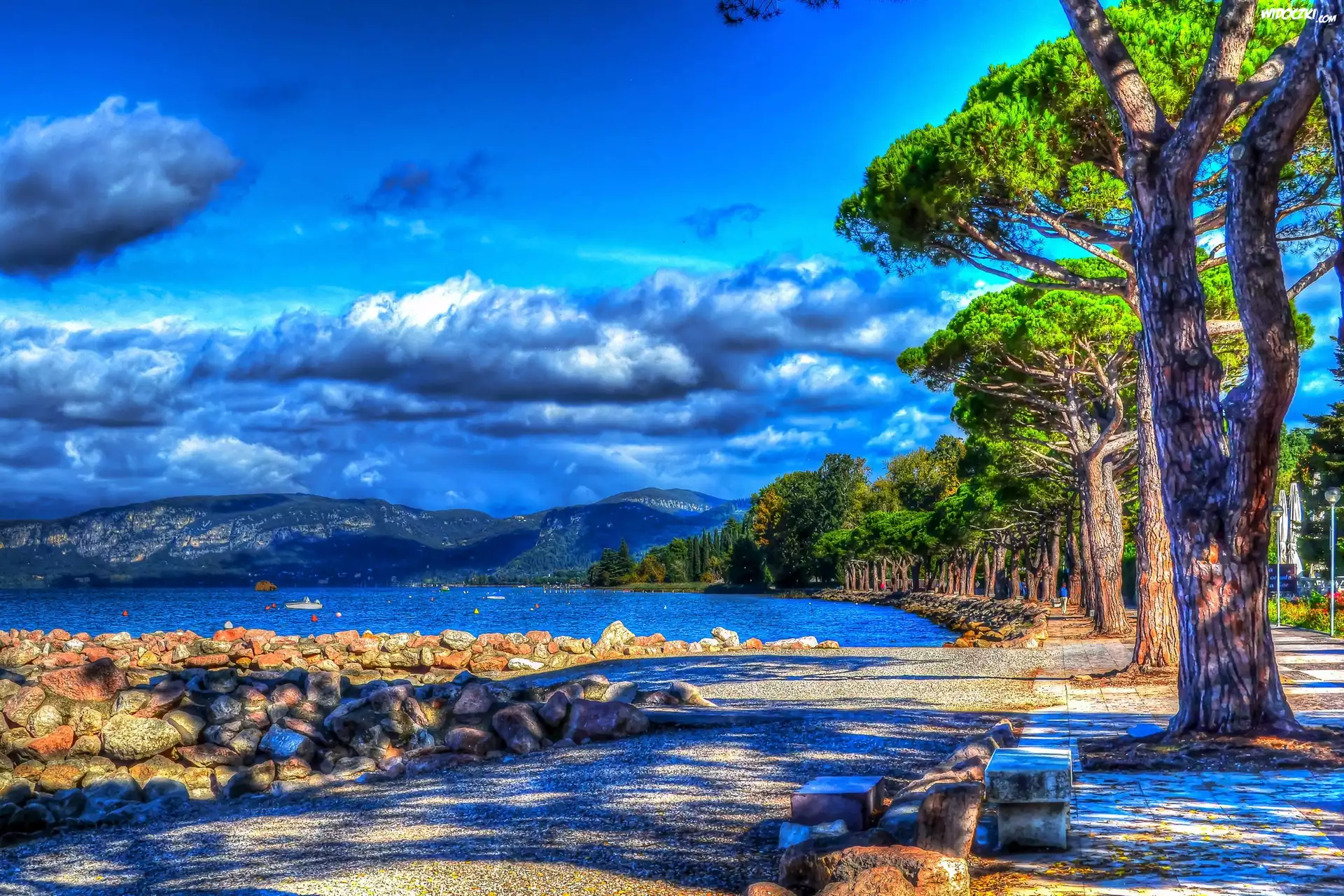 Zdjęcia, Jezioro, Kamienie, Drzewa, Chmury, HDR