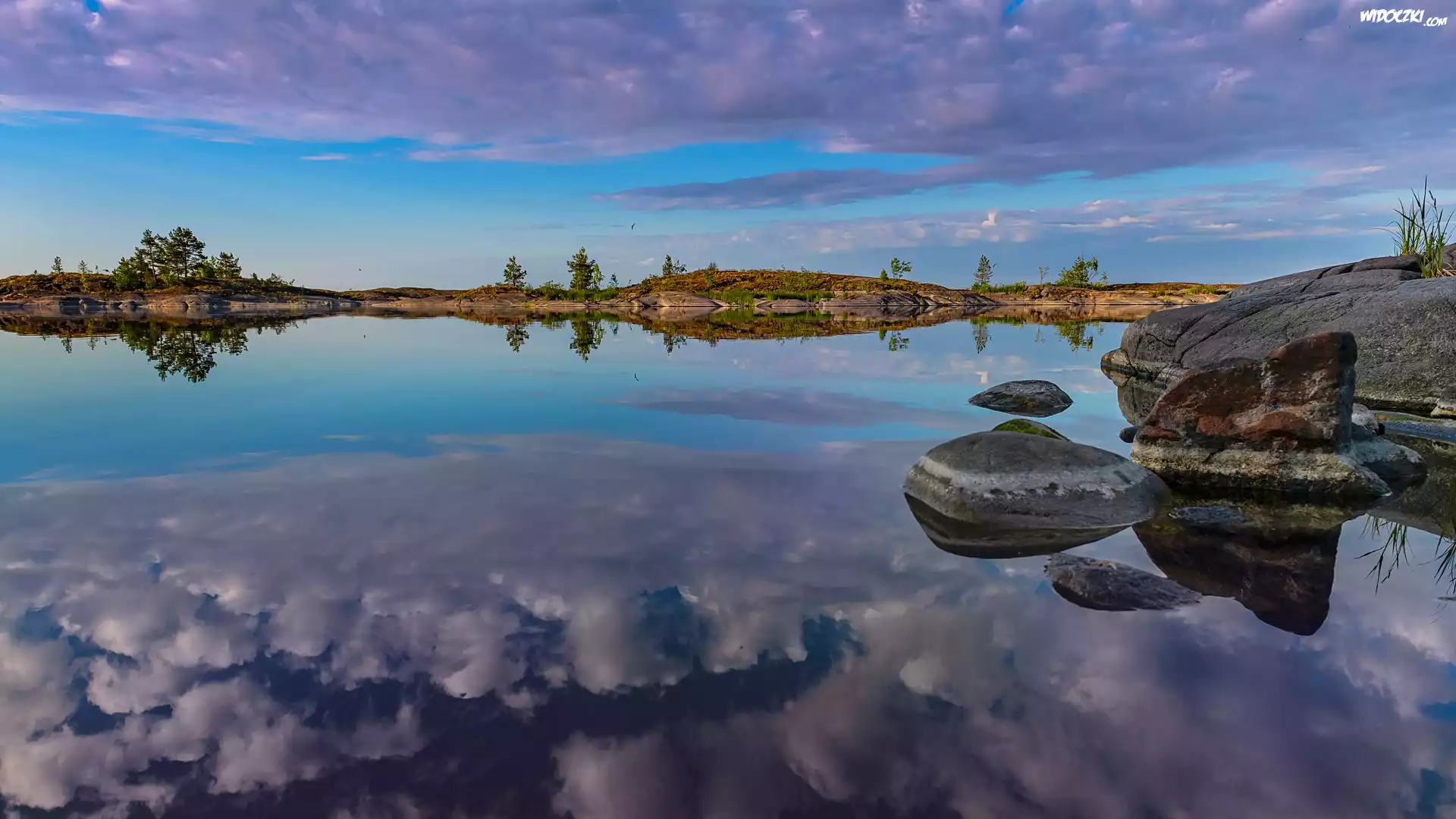 Jezioro, Skały, Drzewa, Chmury, Odbicie