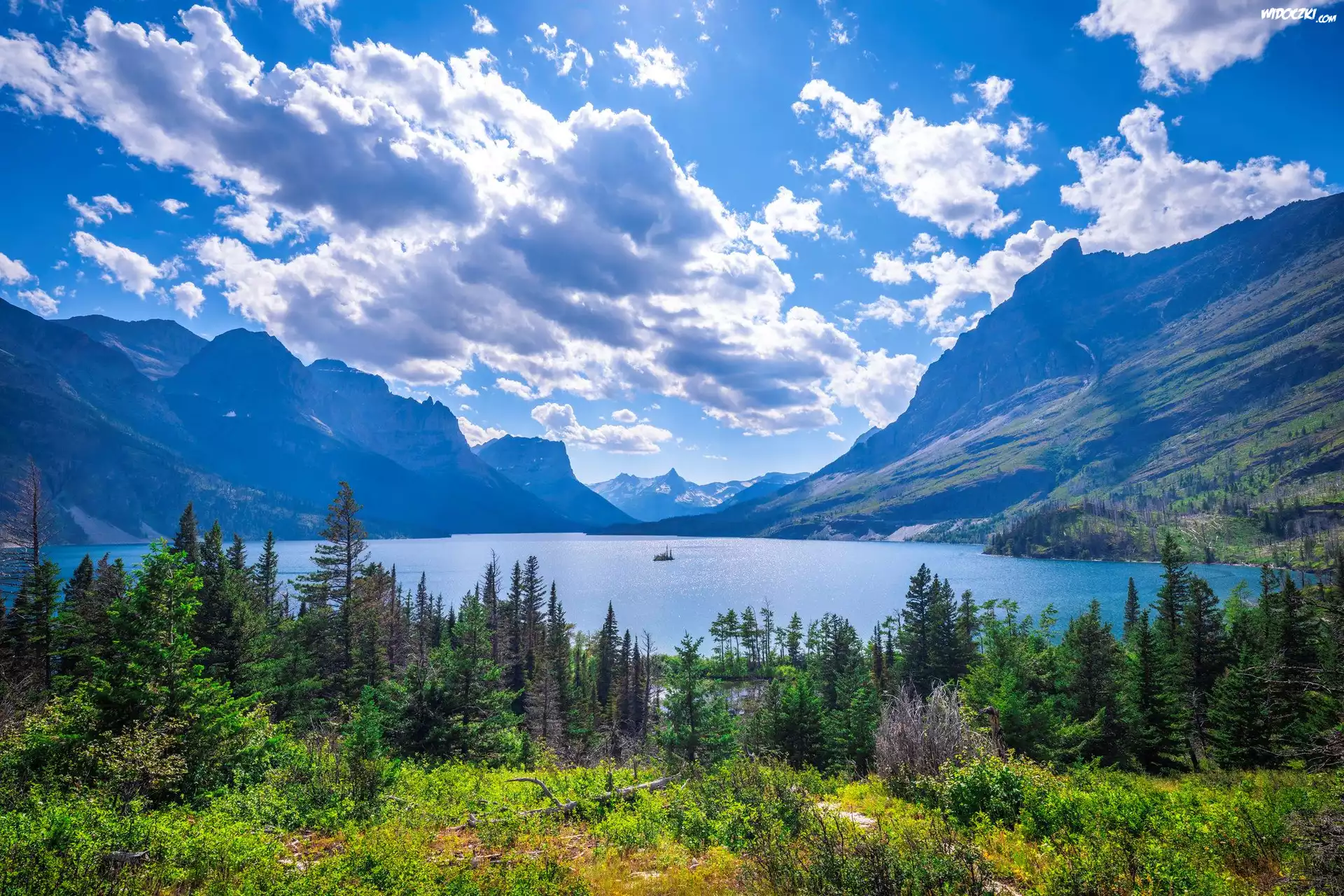 Zdjęcia, Park Narodowy Glacier, Jezioro, Saint Mary Lake, Drzewa, Góry, Chmury, Montana, Stany Zjednoczone