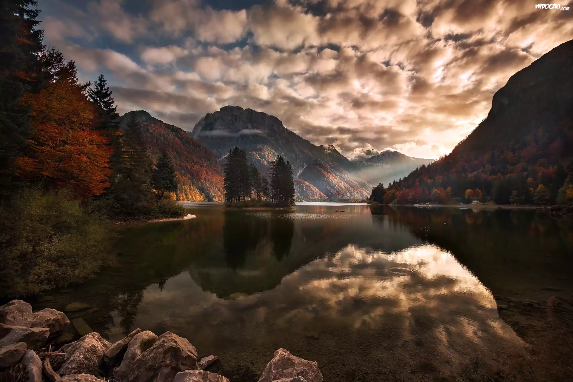 Zdjęcia, Jezioro, Kamienie, Góry, Chmury, Odbicie