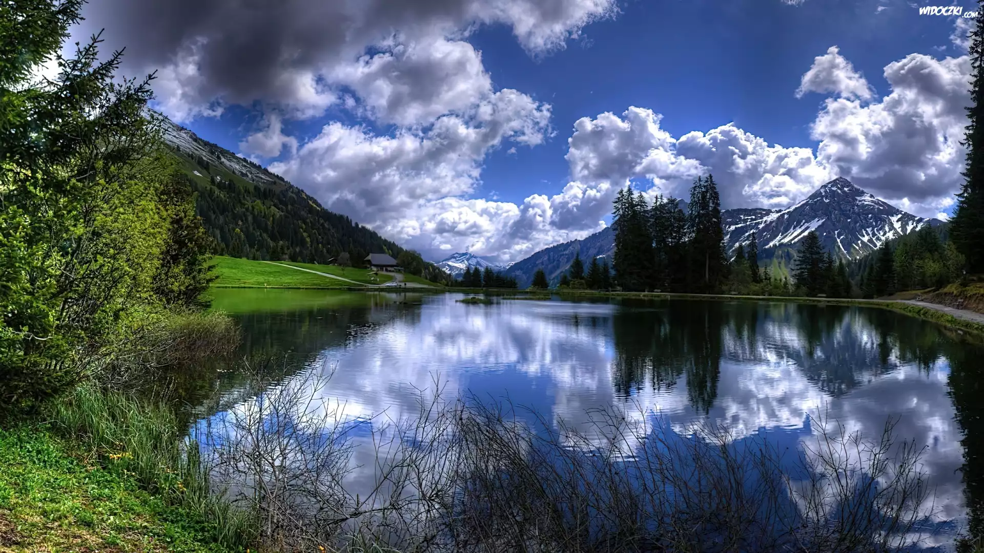 Zdjęcia, Jezioro, Góry, Chmury, Lasy