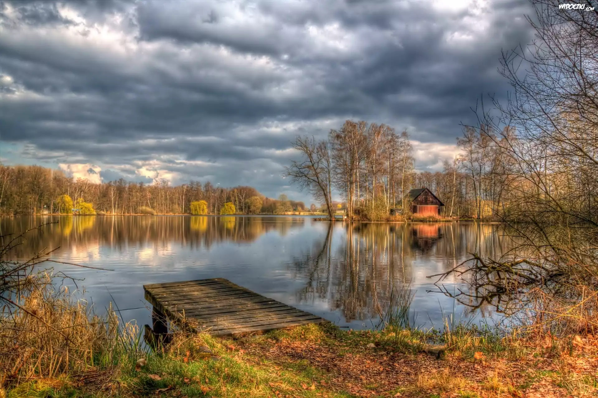 Zdjęcia, Jezioro, Pomost, Las, Chmury, Jesień