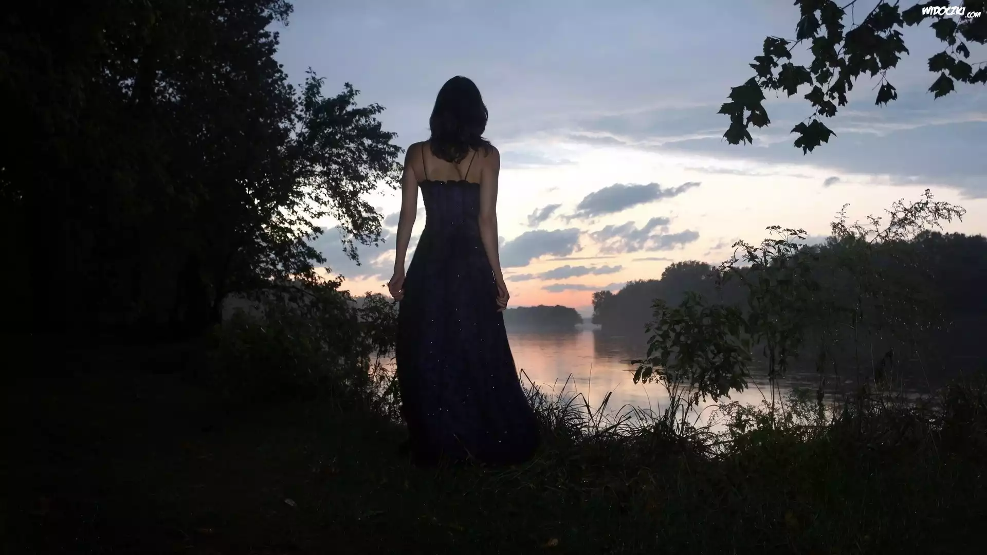 Zdjęcia, Jezioro, Kobieta, Lasy, Chmury, Zmrok