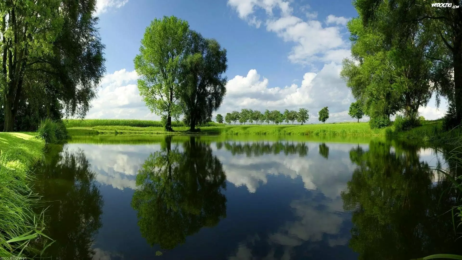 Zdj臋cia, Jezioro, Niebo, Chmury, Drzewa