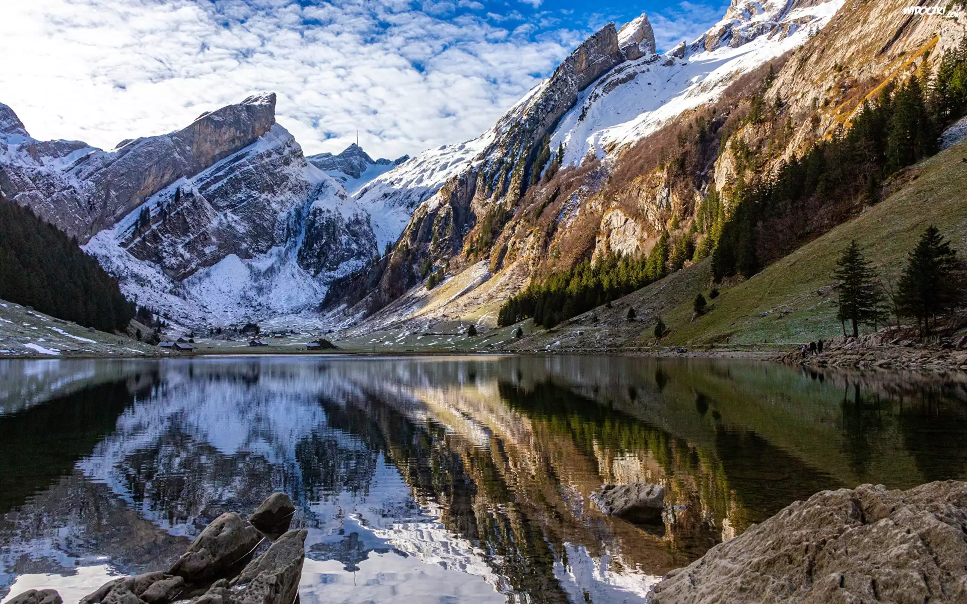 Zdjęcia, Góry, Śnieg, Odbicie, Jezioro, Drzewa, Chmury