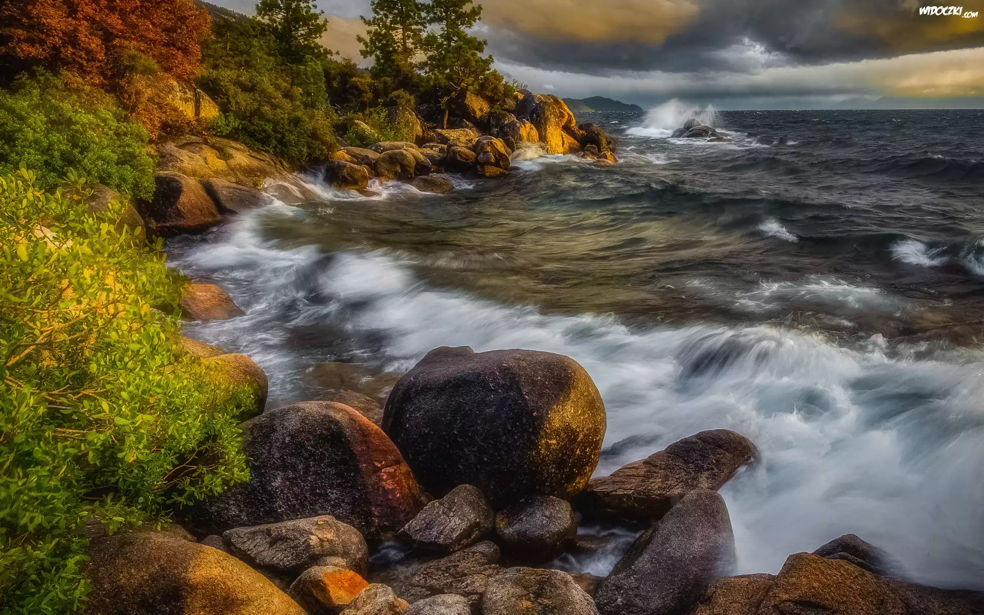 Zdjęcia, Jezioro Tahoe, Fale, Kamienie, Drzewa, Rośliny, Chmury, Stany Zjednoczone