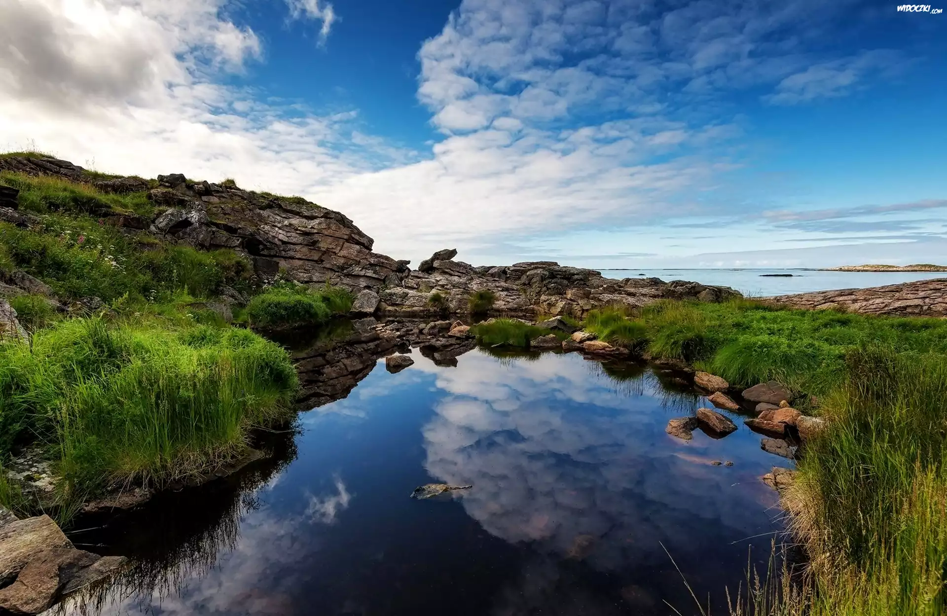 Zdjęcia, Jezioro, Skały, Chmury, Odbicie