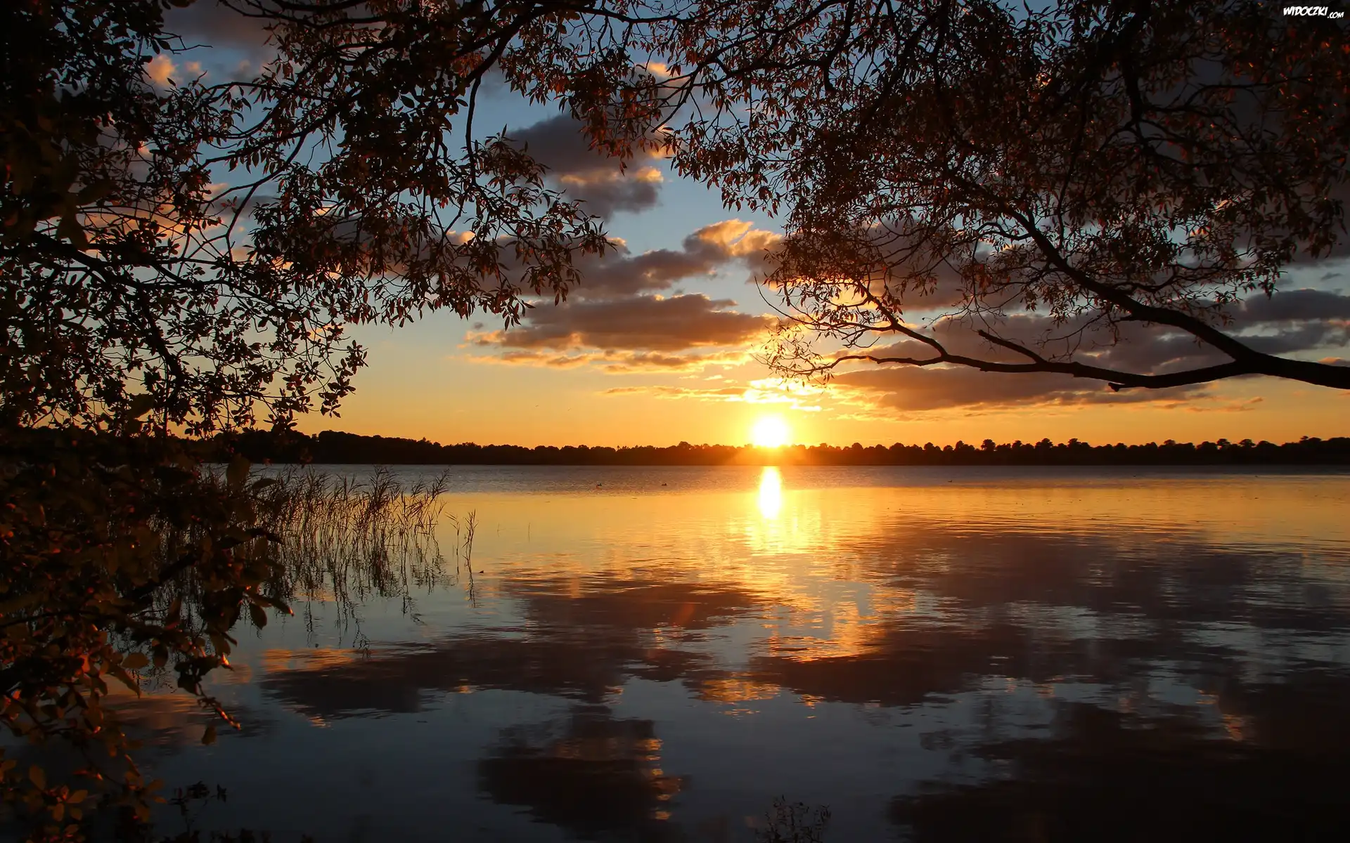 Jezioro, Zachód słońca, Chmury, Drzewa
