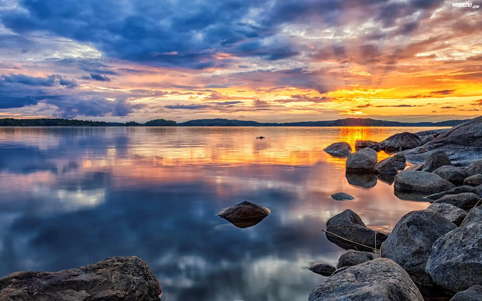 Jezioro, Zachód słońca, Chmury, Kamienie