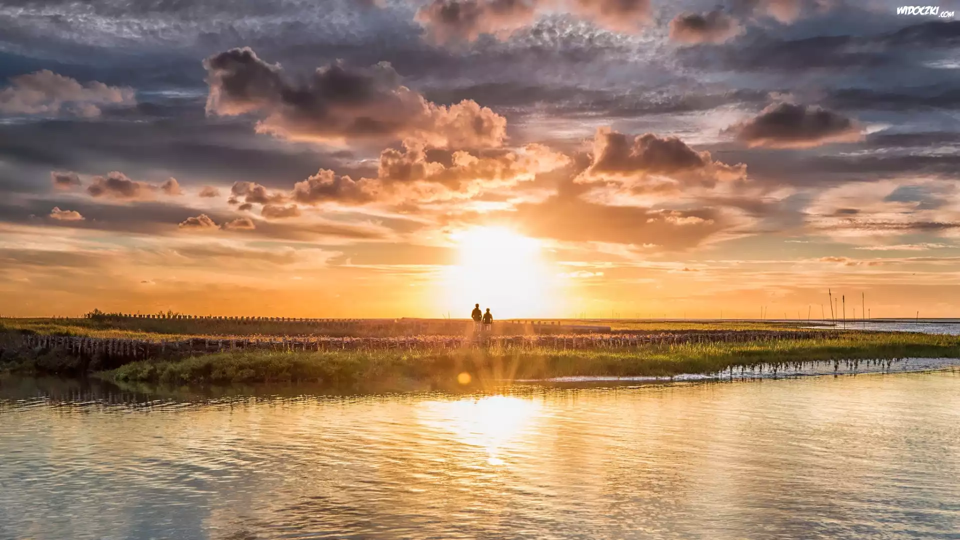 Jezioro, Zachód słońca, Chmury, Ludzie