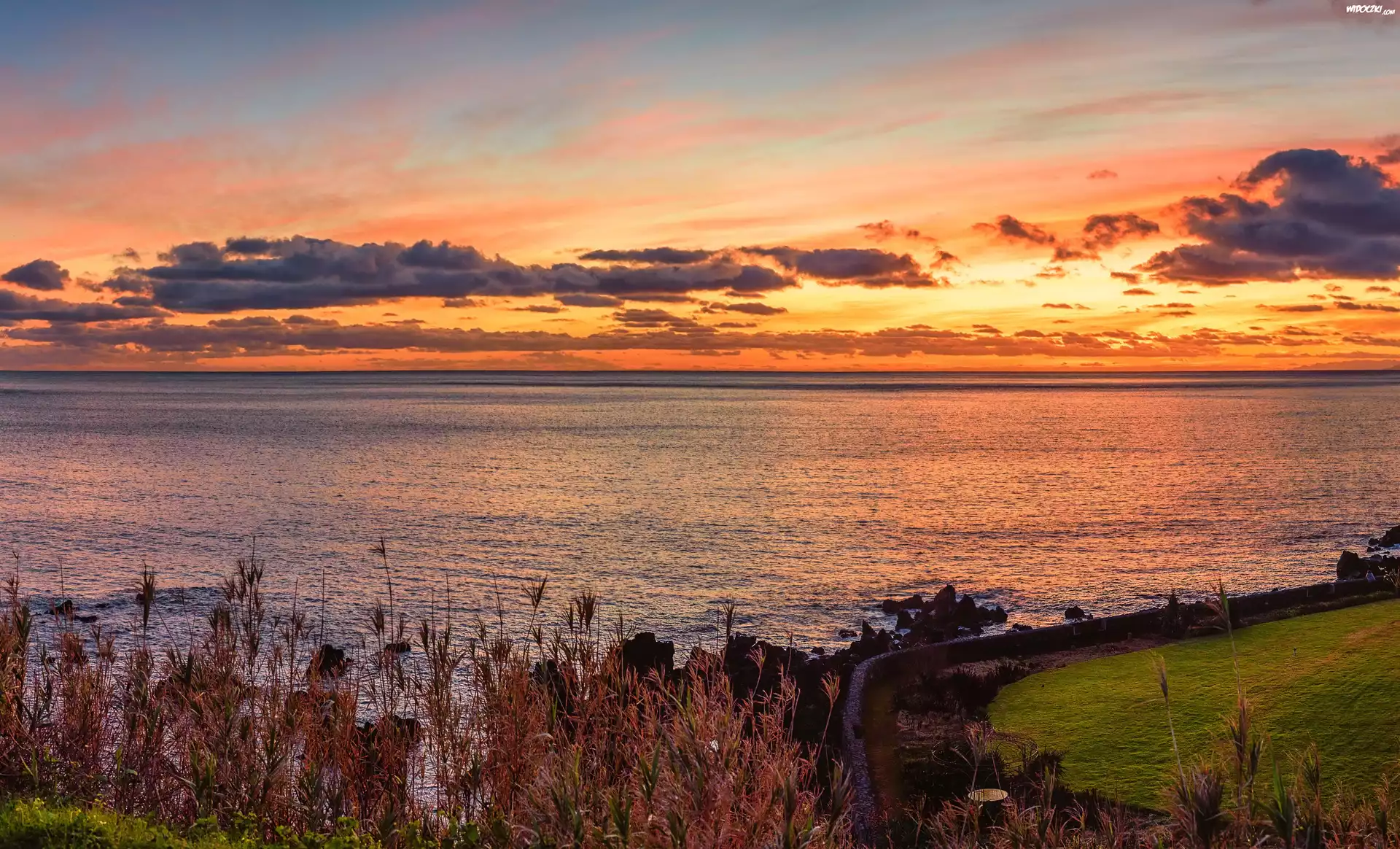 Jezioro, Zachód słońca, Chmury, Roślinność