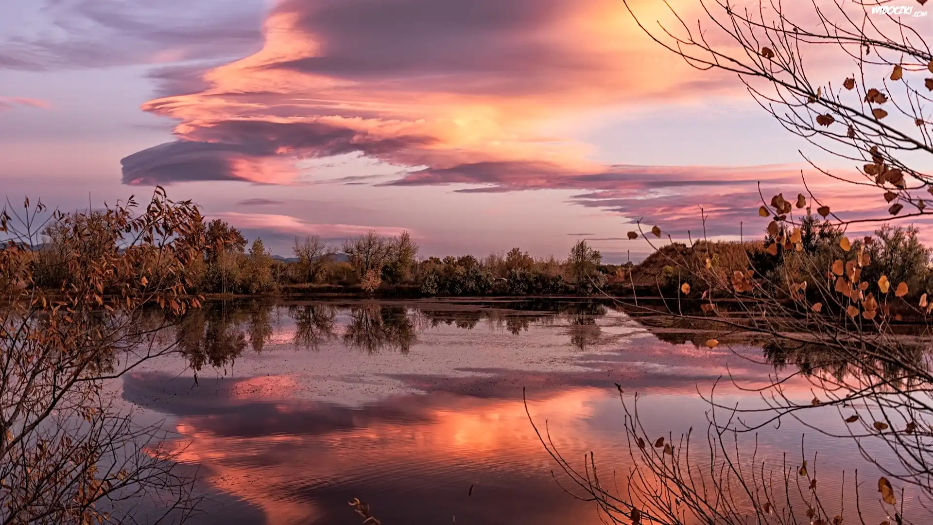 Zdjęcia, Jezioro, Drzewa, Zachód słońca, Chmury, Odbicie