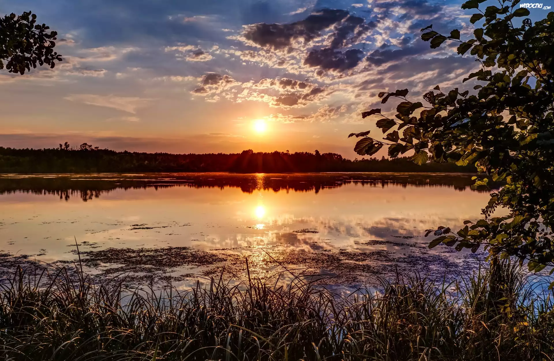 Jezioro, Drzewa, Zachód słońca, Chmury, Roślinność