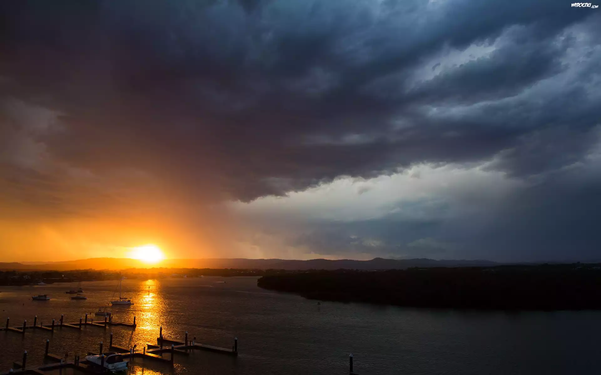 Jezioro, Góry, Zachód słońca, Chmury, Łodzie