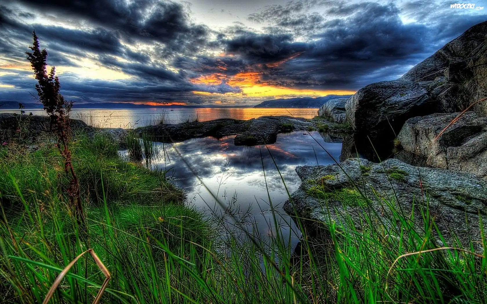 Zdjęcia, Jezioro, Kamienie, Zachód, Słońca, Chmury, Zarośla