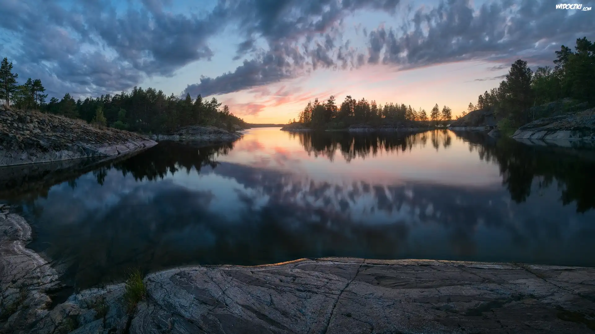Jezioro, Skały, Zachód słońca, Chmury, Drzewa
