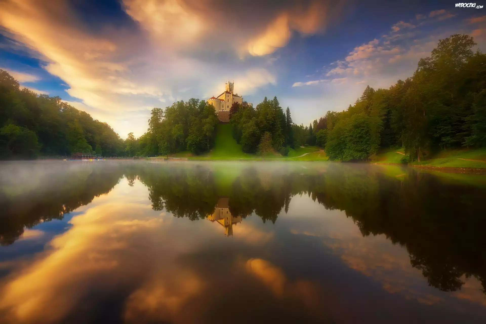 Zdjęcia, Wzgórze, Jezioro, Drzewa, Zamek Trakoscan, Chmury, Odbicie, Chorwacja