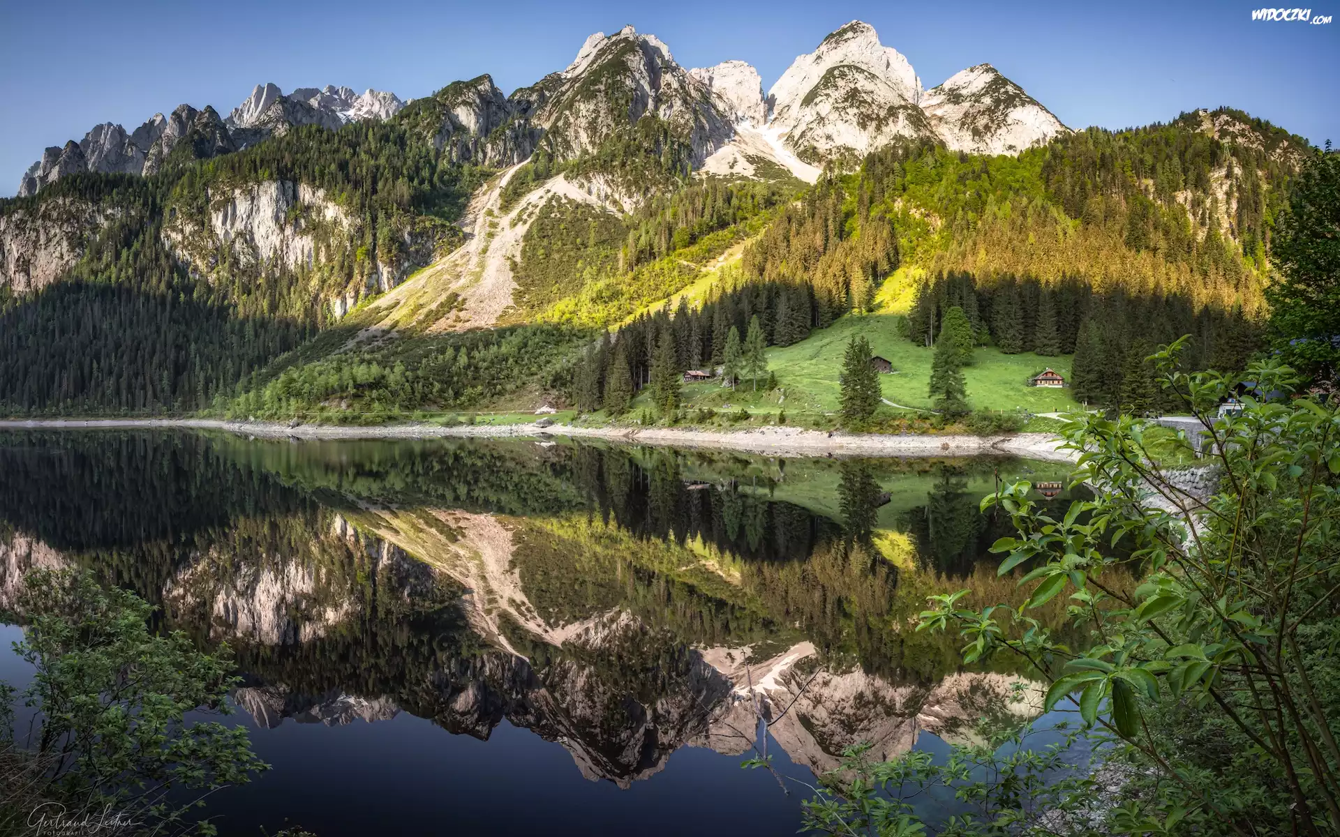 Austria, Góry, Dachstein, Jezioro Gosauseen, Drzewa, Odbicie