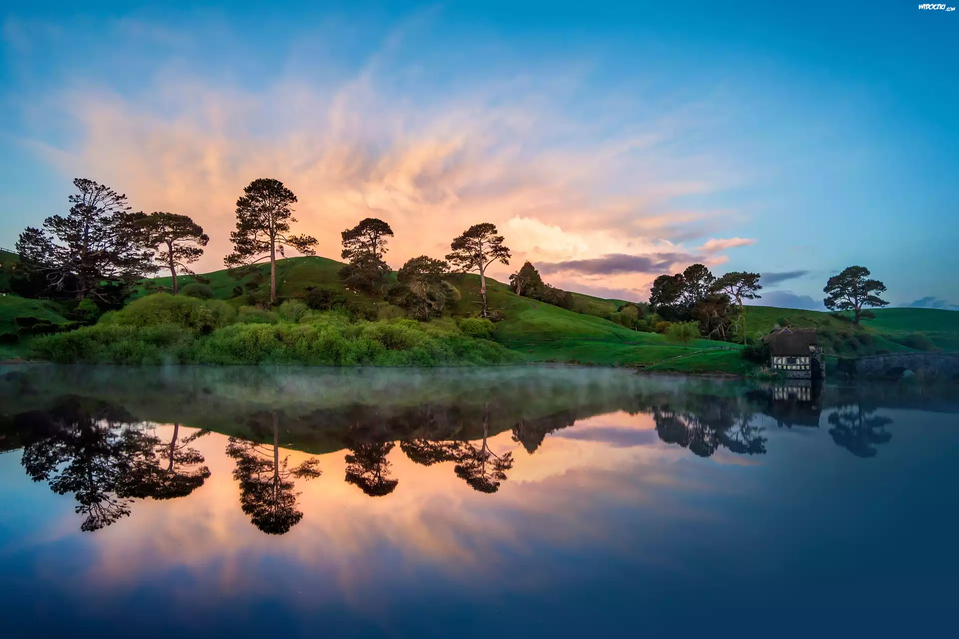Jezioro, Niebo, Drzewa, Dom ,Odbicie