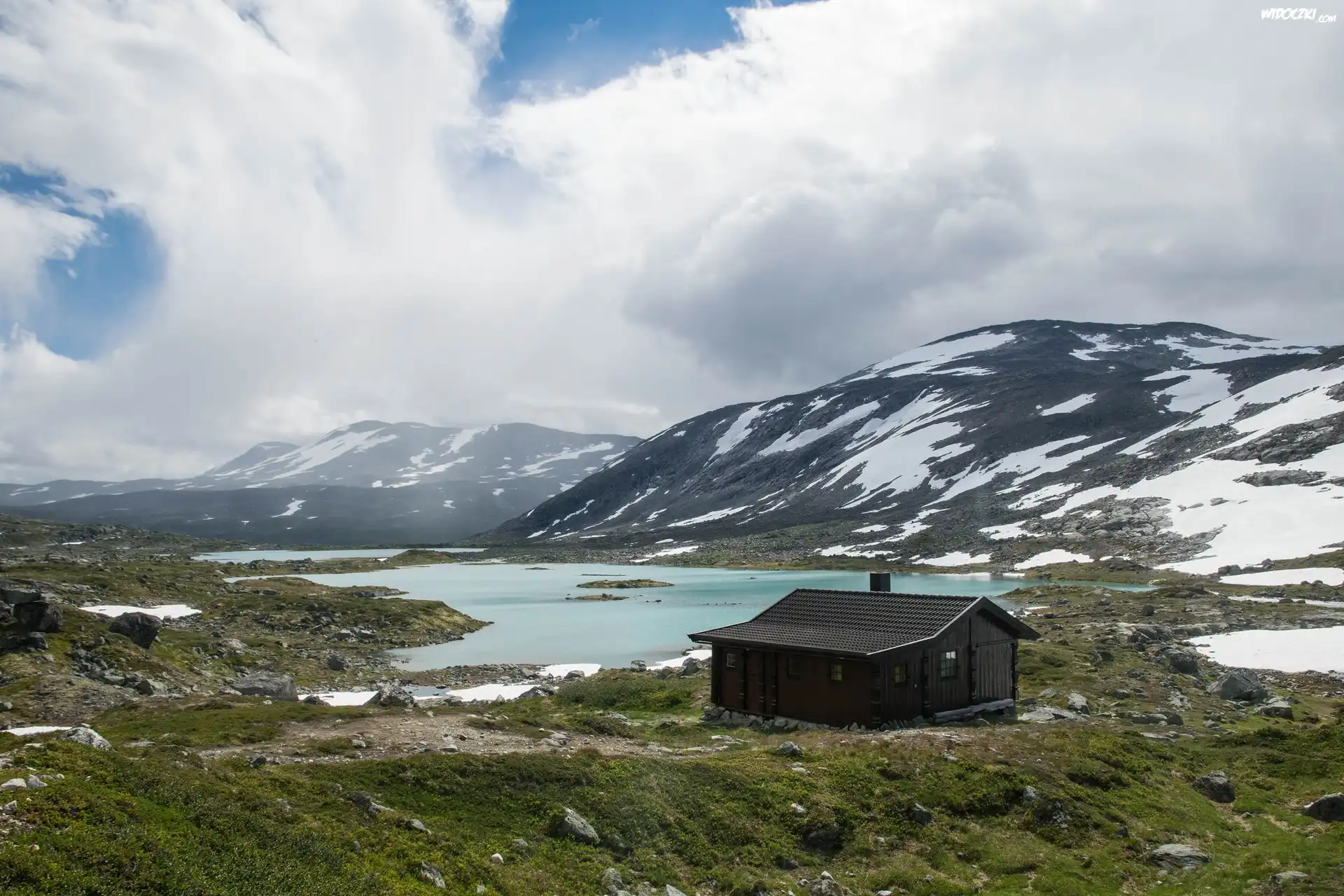 Zdjęcia, Jezioro, Ośnieżone, Góry, Dom, Zima