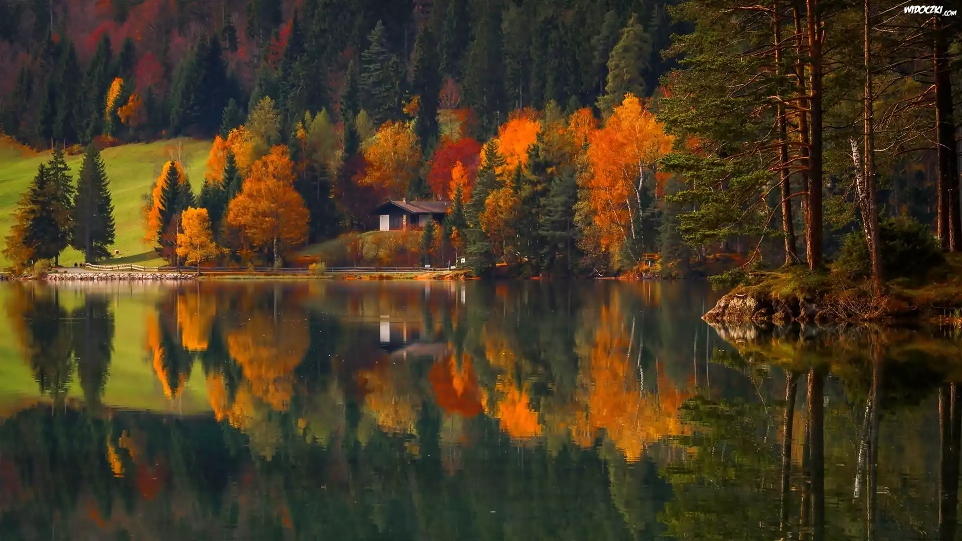 Zdjęcia, Jezioro, Góry, Lasy, Dom, Jesień