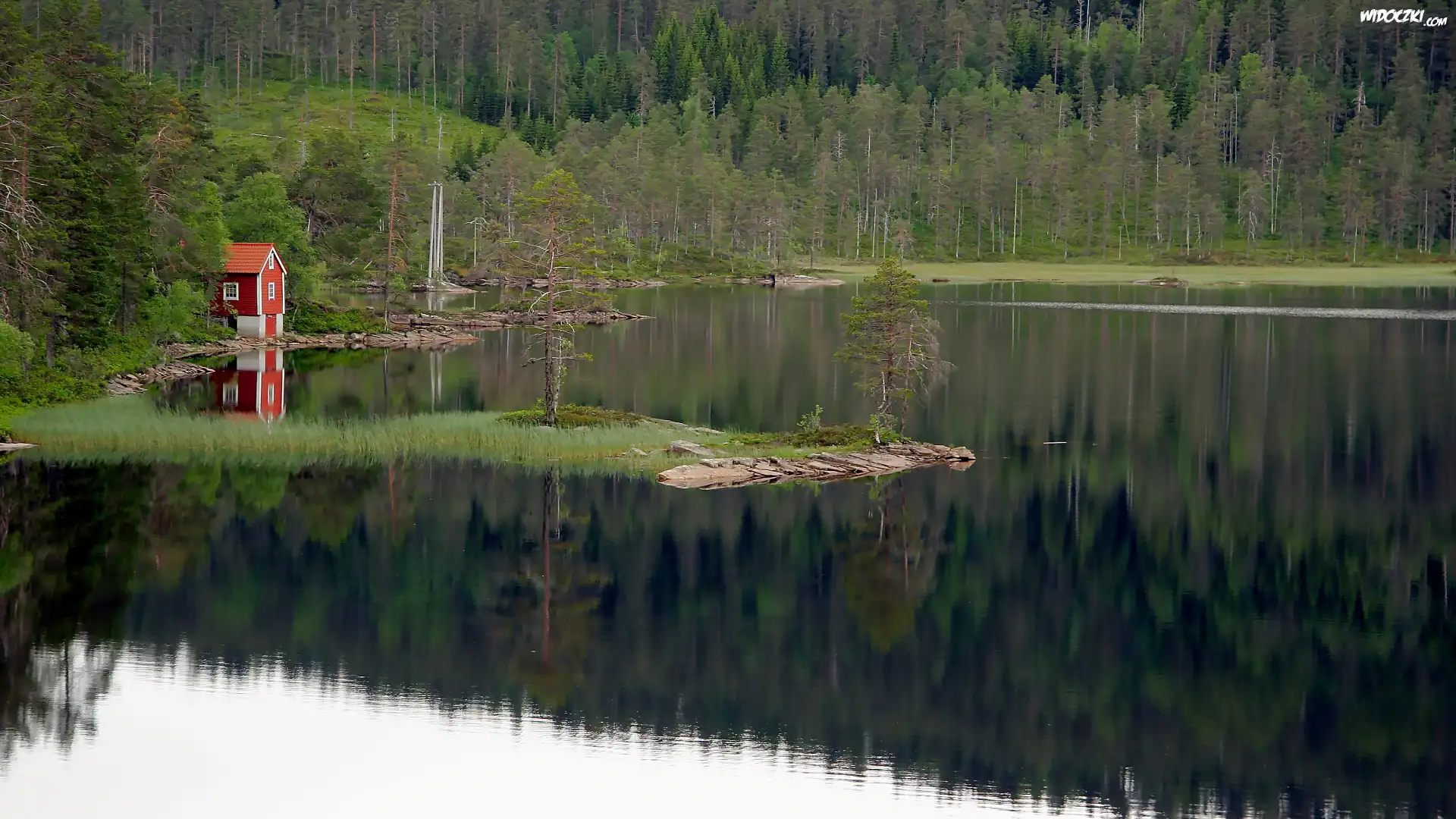 Zdjęcia, Jezioro, Las, Czerwony, Domek, Brzeg