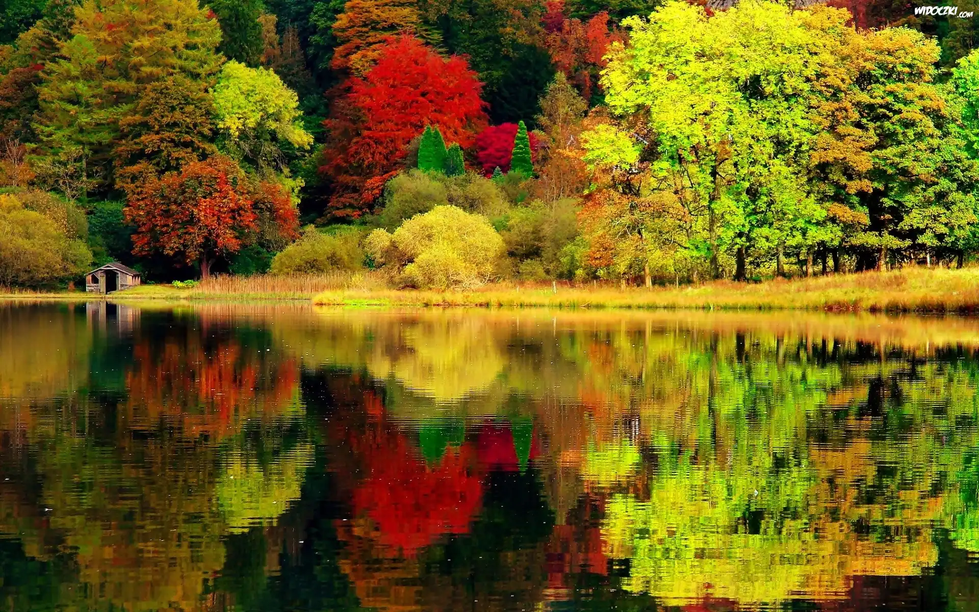 Zdjęcia, Jezioro, Las, Kolorowe, Drzewa, Domek, Jesień
