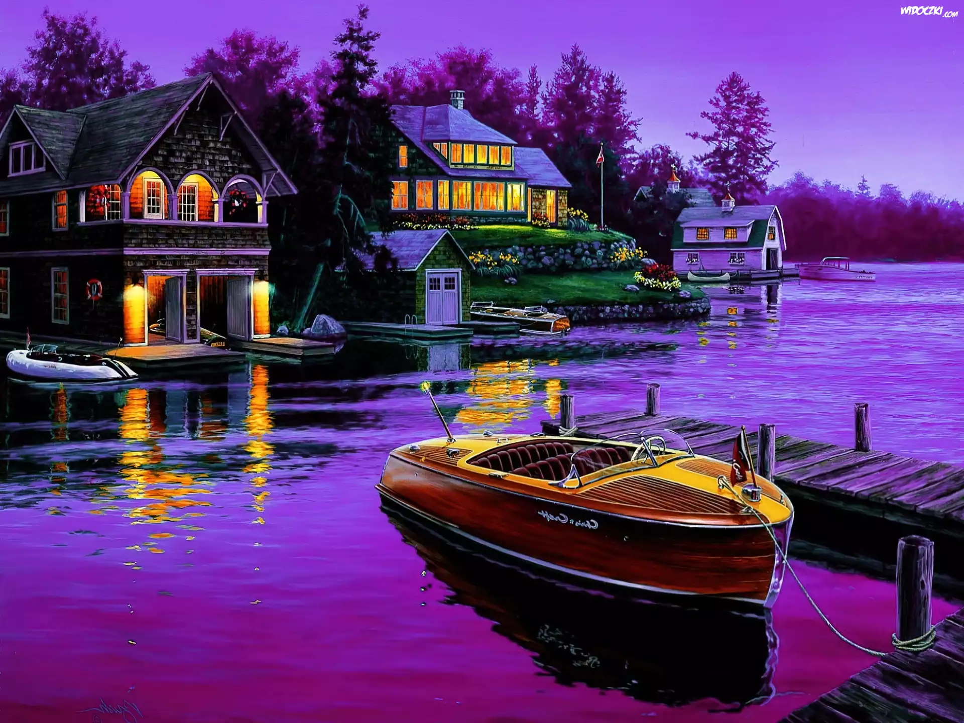 Zdjęcia, Jezioro, Motorówka, Domki, Obraz