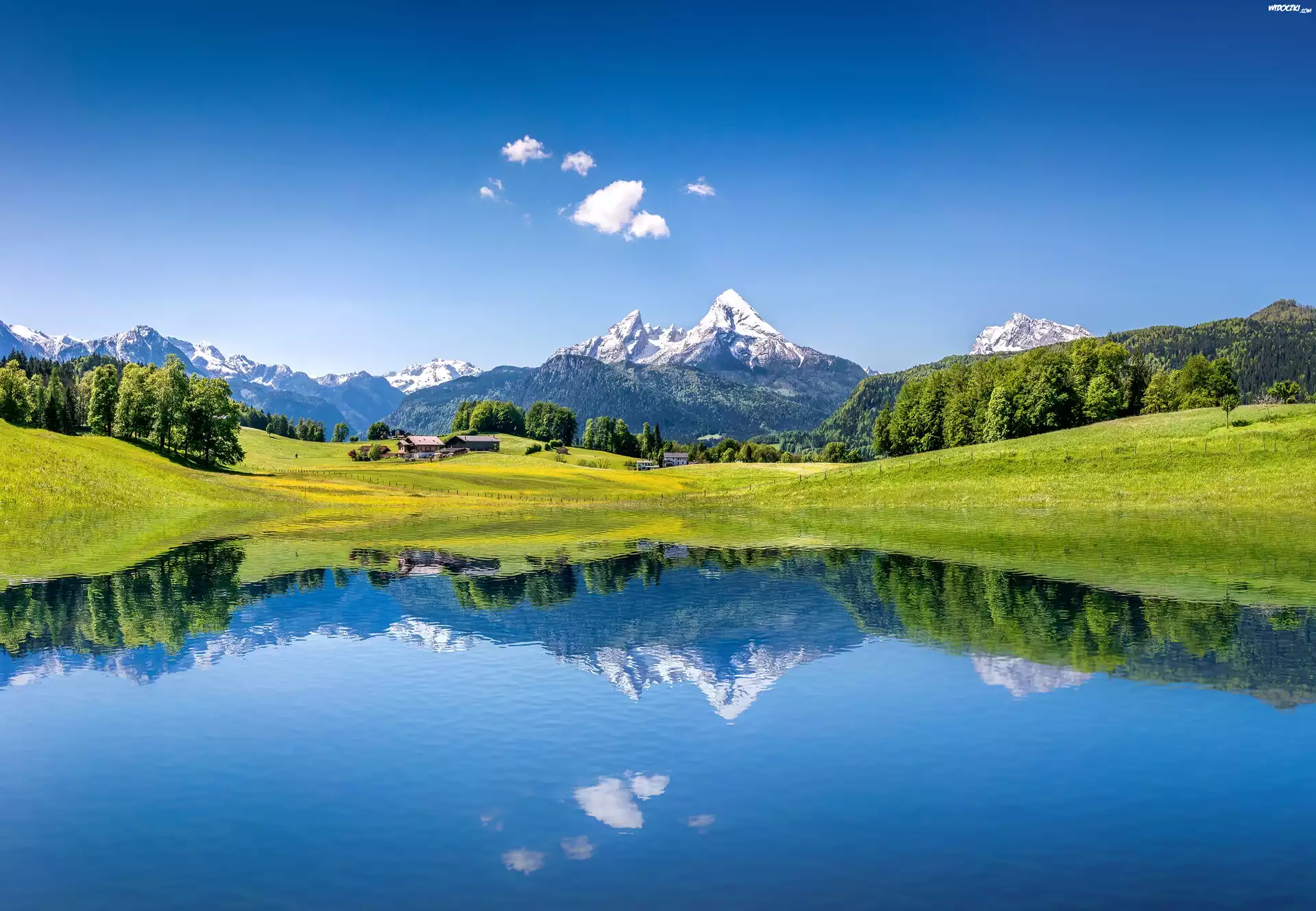 Jezioro, Góry, Łąka, Drzewa, Domy, Odbicie