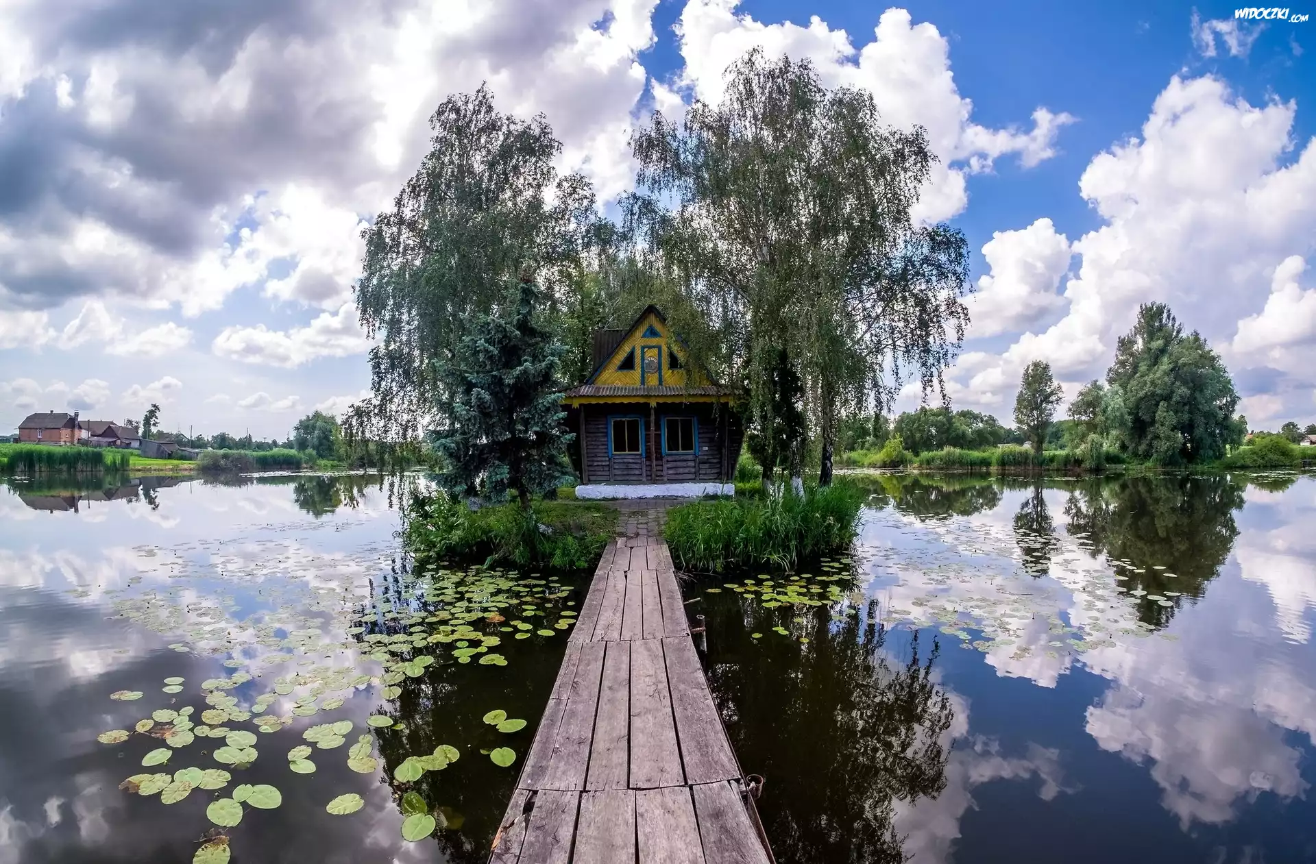 Zdj臋cia, Jezioro, Drzewa, Domy, Pomost
