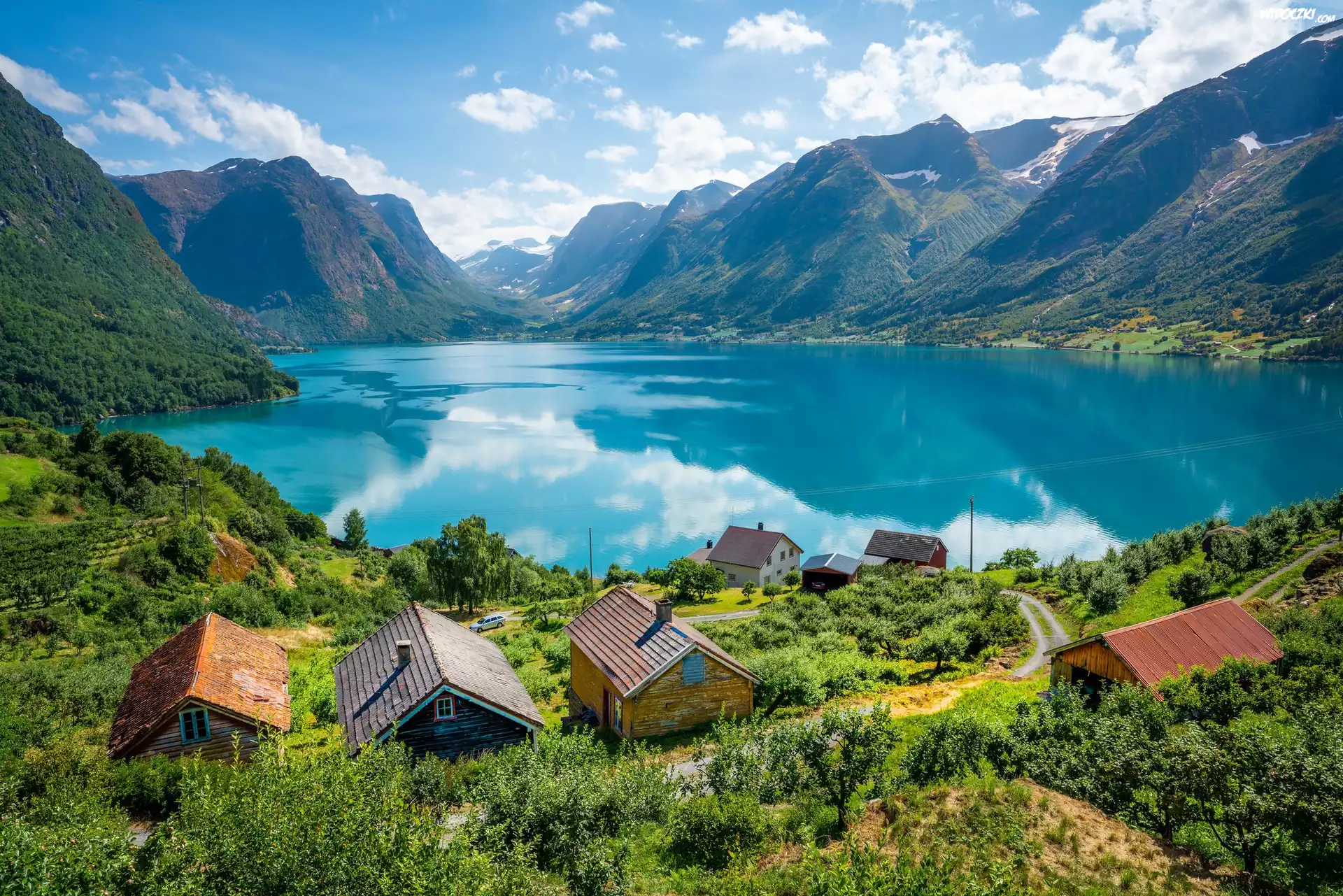 Zdjęcia, Jezioro, Góry, Domy, Drzewa