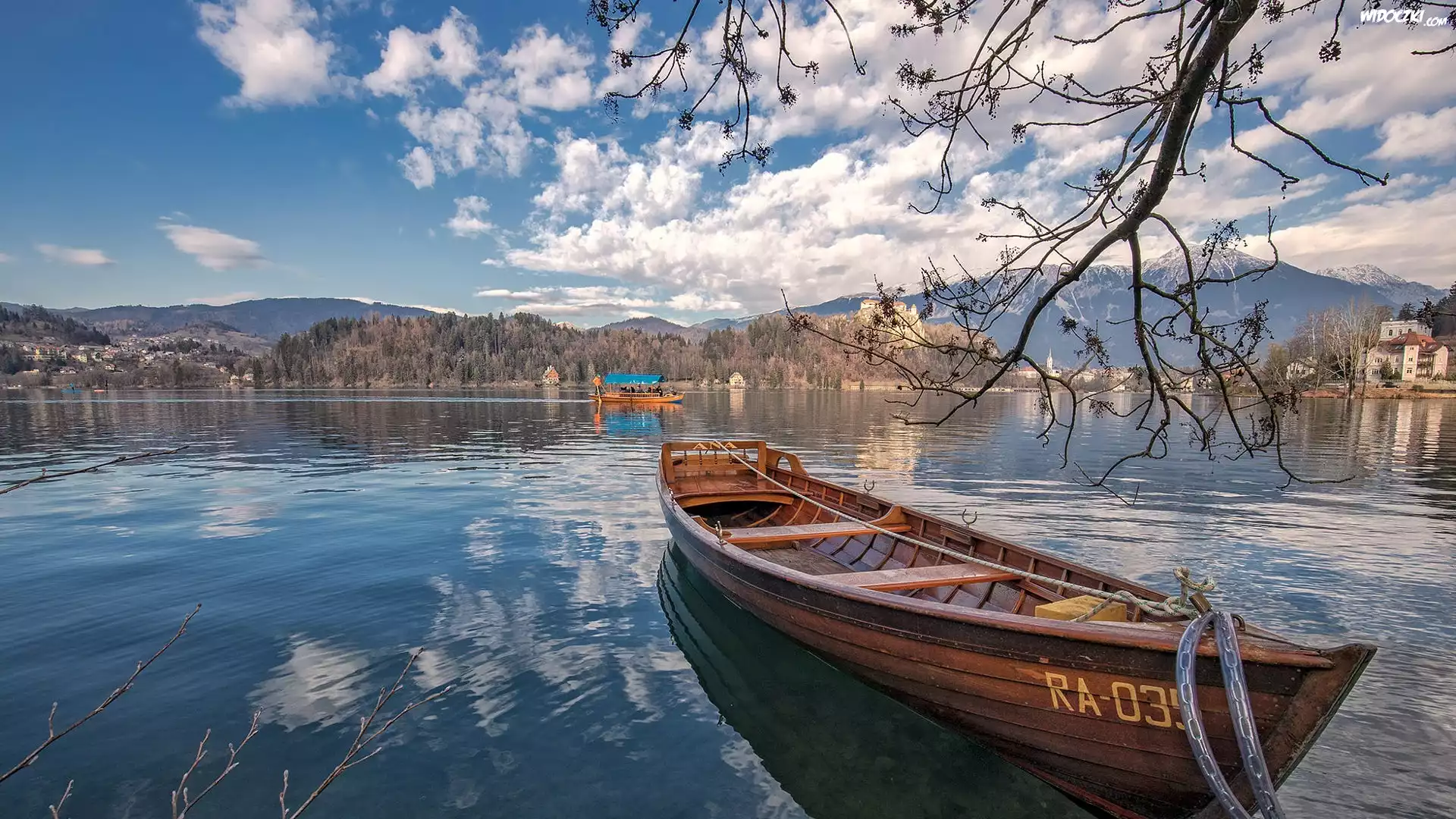 Zdjęcia, Jezioro, Bled Lake, Łódka, Góry, Alpy Julijskie, Drzewa, Domy, Słowenia